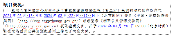 1、采购项目名称:永顺县青坪镇双合村两岔溪至曹家寨道路整修工程(第二次)