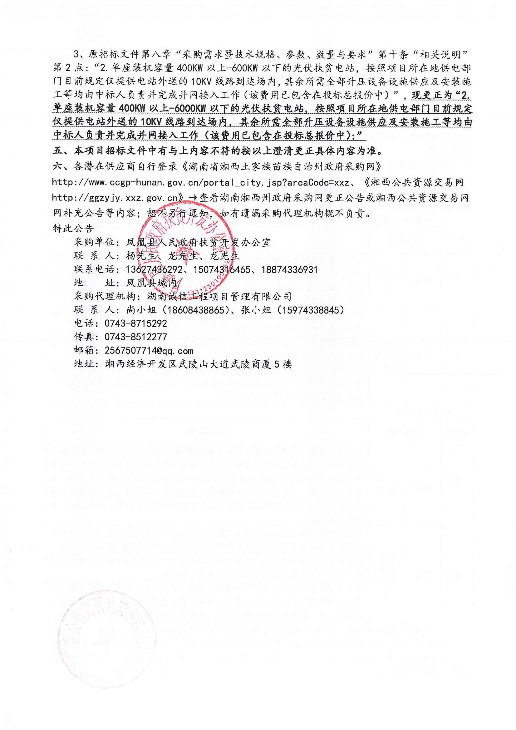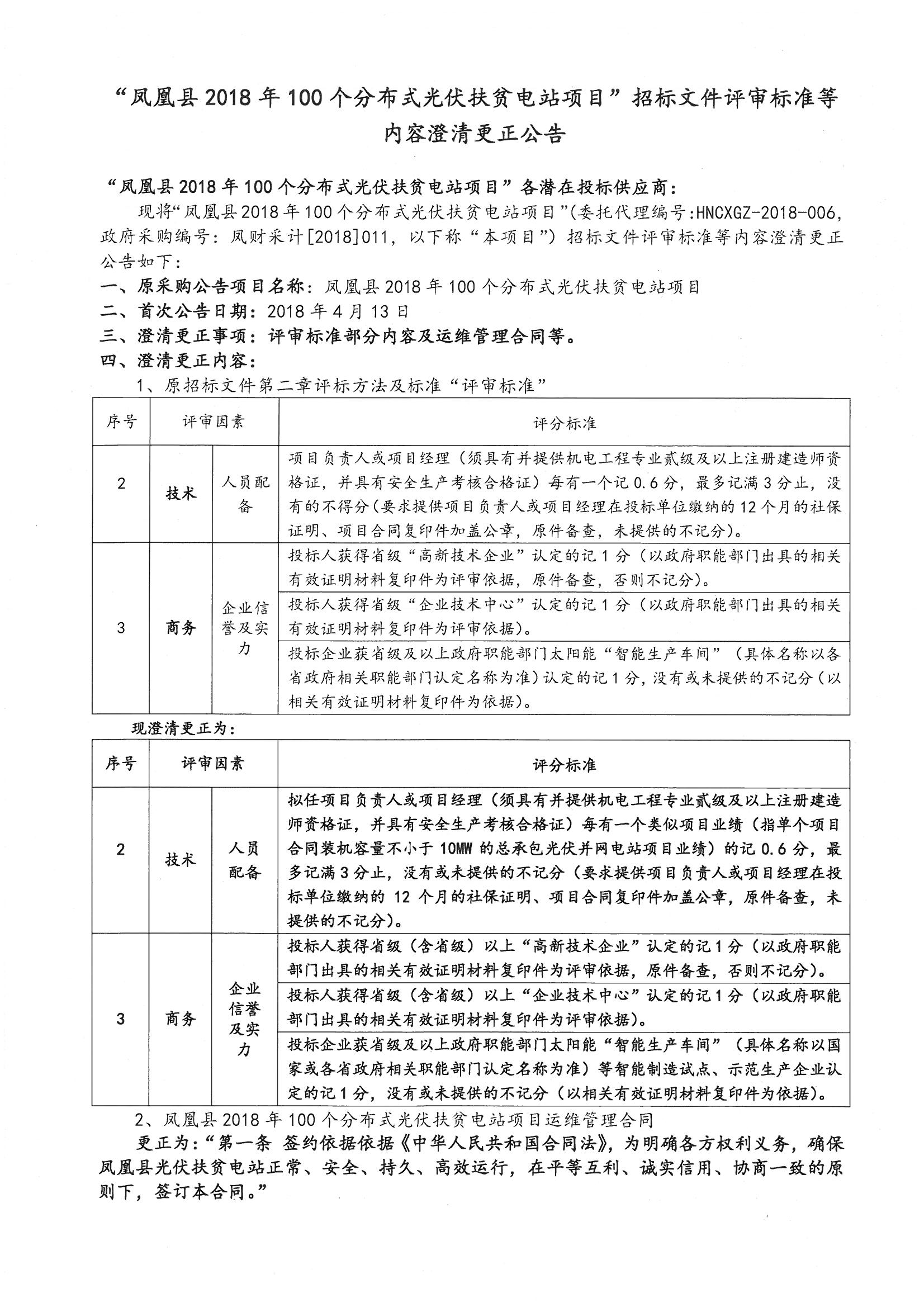 “凤凰县2018年100个分布式光伏扶贫电站项目”招标文件评审标准等内容澄清更正公告