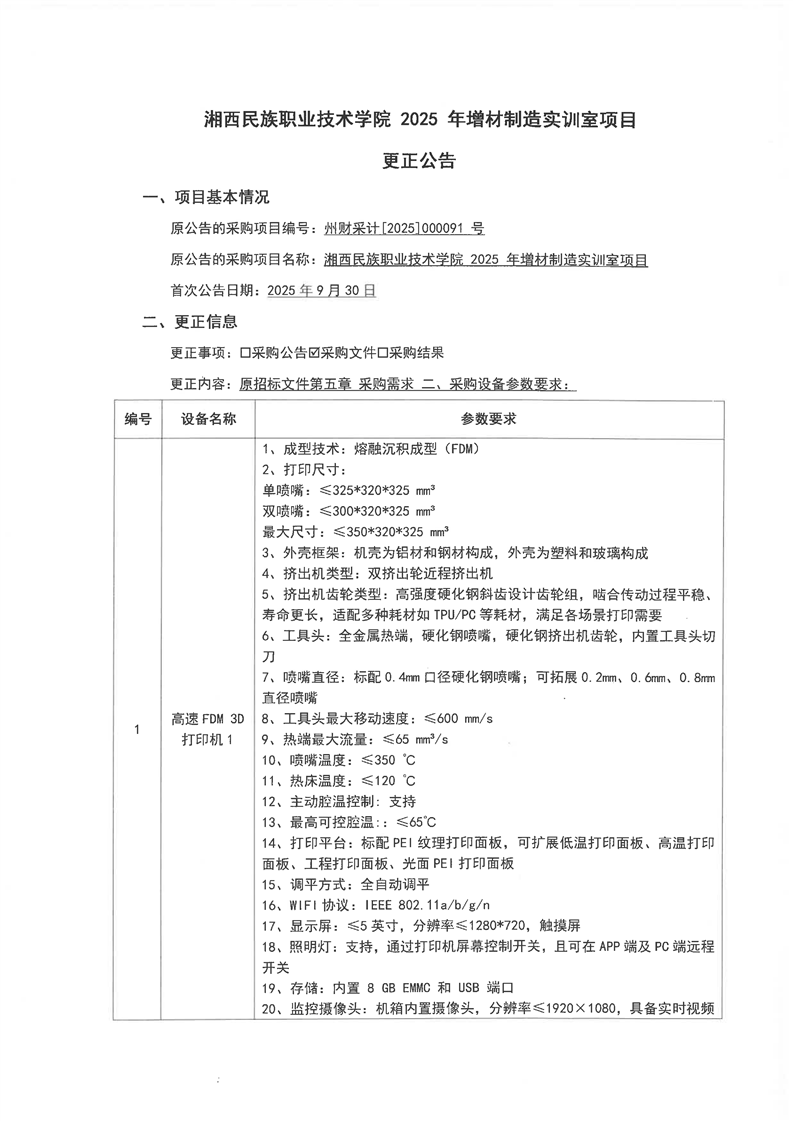 湘西民族职业技术学院2025年增材制造实训室项目招标公告[变更公告]