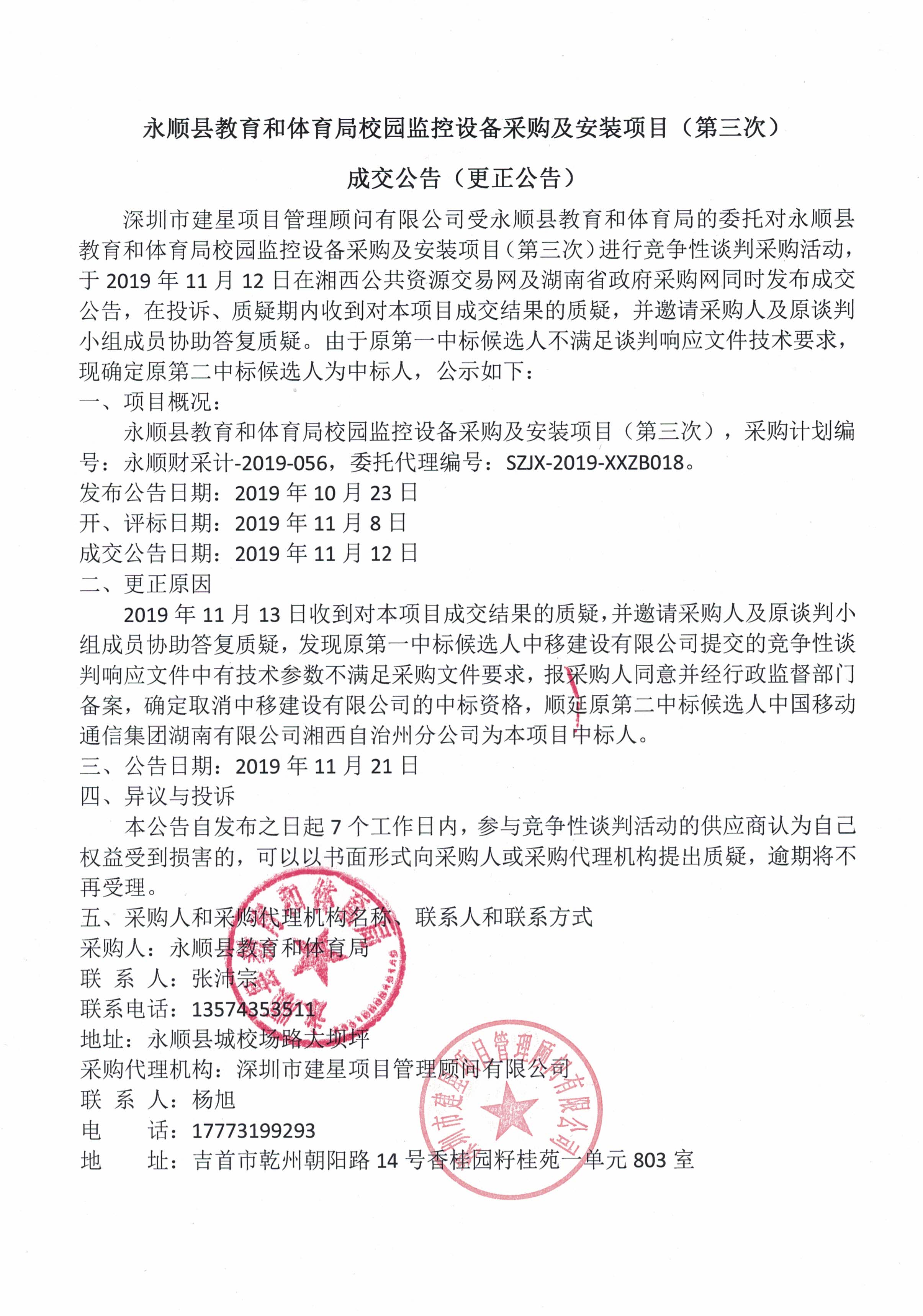 深圳市建星项目管理顾问有限公司受永顺县教育和体育局的委托对永顺县教育和体育局校园监控设备采购及安装项目(第三次)进行竞争性谈判采购活动,于2019年11月12日在湘西公共资源交易网及湖南省政府采购网同时发布成交公告,在投诉、质疑期内收到对本项目成交结果的质疑,并邀请采购人及原谈判小组成员协助答复质疑。由于原第一中标候选人不满足谈判响应文件技术要求,现确定原第二中标候选人为中标人,公示如下: