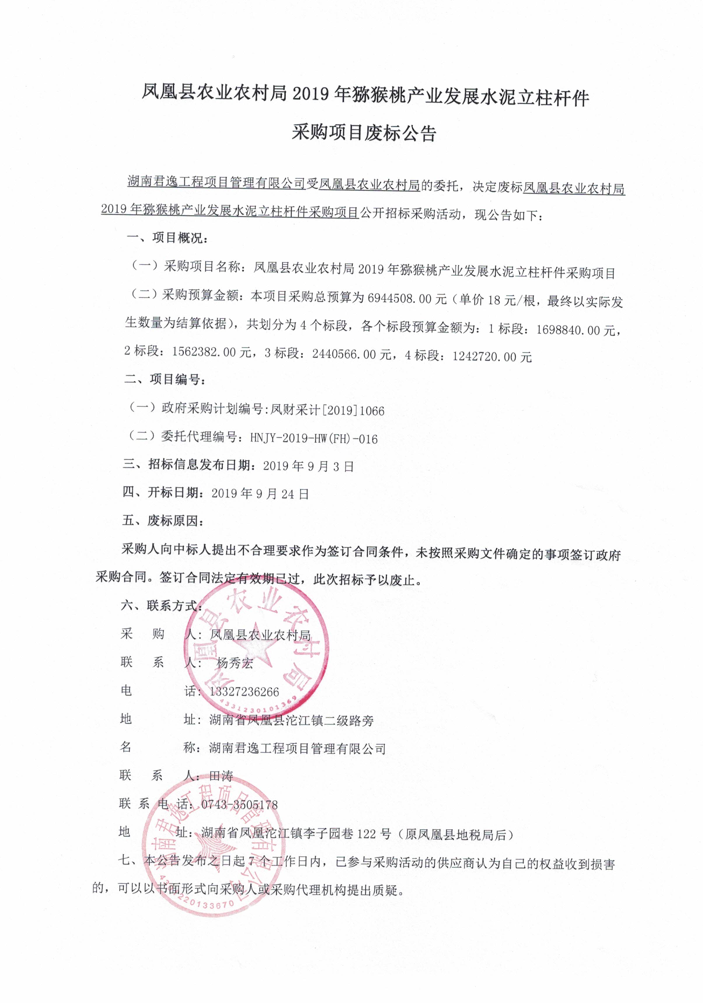 湖南君逸工程项目管理有限公司受凤凰县农业农村局的委托,决定废标凤凰县农业农村局2019年猕猴桃产业发展水泥立柱杆件采购项目公开招标采购活动,现公告如下:
