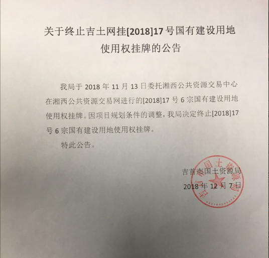 关于终止吉土网挂[2018]17号国有建设用地使用权挂牌的公告