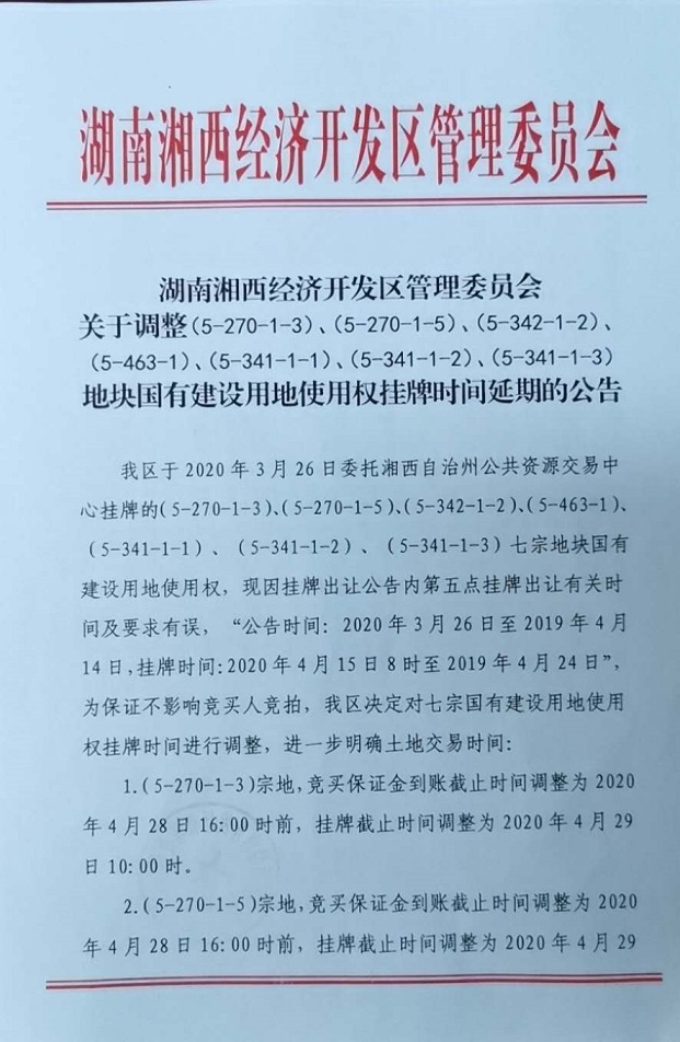 湘西经济开发区管委会(5-341-1-3)地块国有建设用地使用权(延期公告)