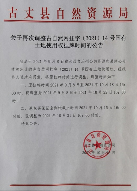 古丈县自然资源局[2021]14号地块国有建设用地使用权(延期公告)
