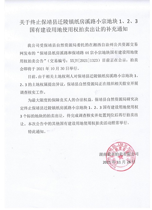 保靖县纸房溪路和保靖路44宗小宗地块国有建设用地使用权(补充通知)