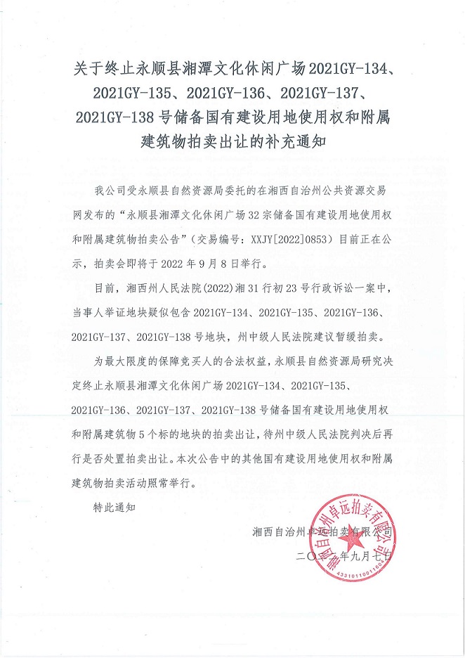 永顺县湘潭文化休闲广场32宗储备国有建设用地使用权和附属建筑物(补充通知)