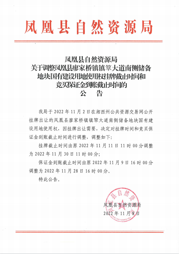 凤凰县廖家桥镇镇竿大道南侧储备地块国有建设用地使用权(延期公告)