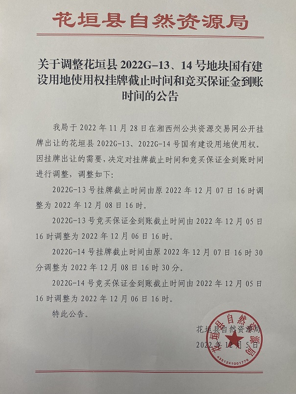 花垣县2022G-14号地块国有建设用地使用权(延期公告)