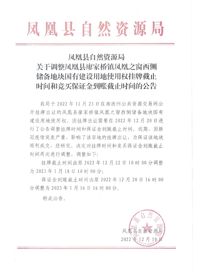 凤凰县廖家桥镇凤凰之窗西侧储备地块国有建设用地使用权(延期公告)