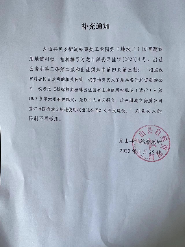 龙山县民安街道办事处工业园旁(地块二)国有建设用地使用权(补充通知)