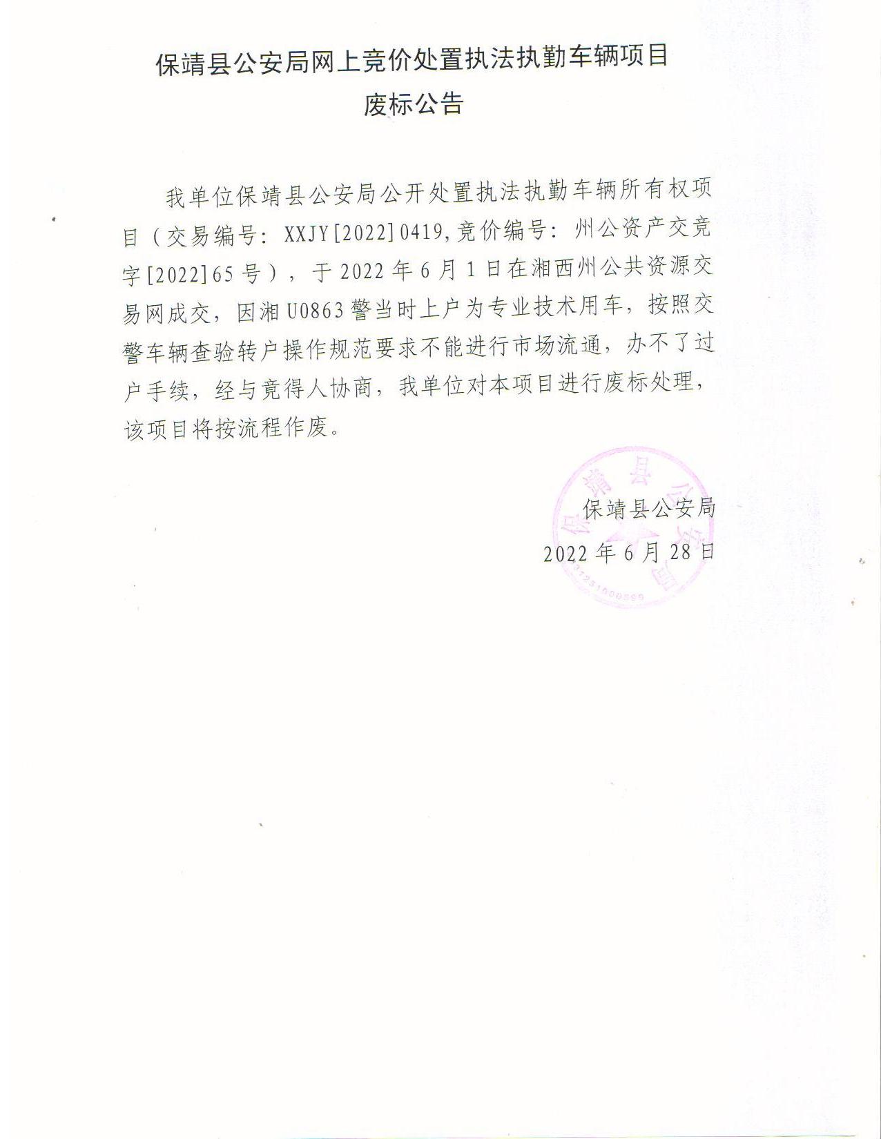 保靖县公安局网上竞价处置湘U0863警执法执勤车一辆废标公告